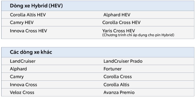 Chương trình được áp dụng cho một số dòng xe nhất định do Toyota Việt Nam phân phối thông qua các Đại lý ủy quyền chính hãng. Bao gồm các dòng xe sau: